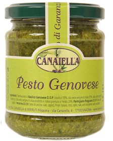 Basilico Genovese D.O.P. 35%, Olio extra vergine di oliva italiano 30%, Parmigiano Reggiano D.O.P. 6% (latte, sale caglio), Pecorino Romano D.O.P. 3% (latte di pecora, sale, caglio), pinoli italiani 9%, noci 15%, aglio, sale, acido lattico, acido ascorbico, acido sorbico.